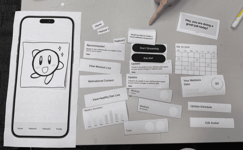 To gauge initial user perceptions of the top concepts, I led the creation of paper prototypes. The team collaboratively organized on-site testing and gathered feedback from eight participants on campus identified as potential users of wellness planners.