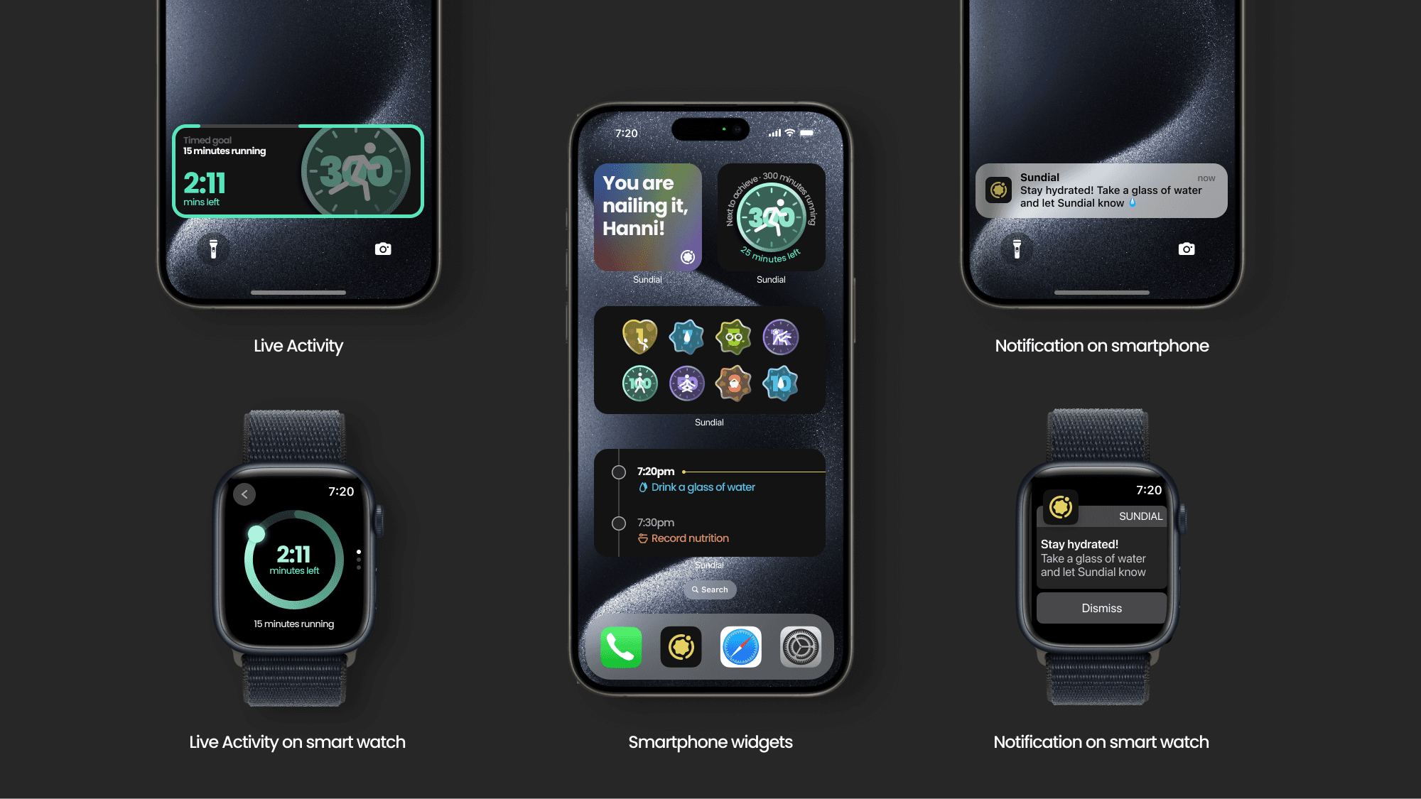 While the core app experience is essential, I realized that time spent outside the app can boost user engagement, especially given the nature of a planner. I designed live activities, notification templates, and widgets across multiple platforms, making the Sundial experience more comprehensive.