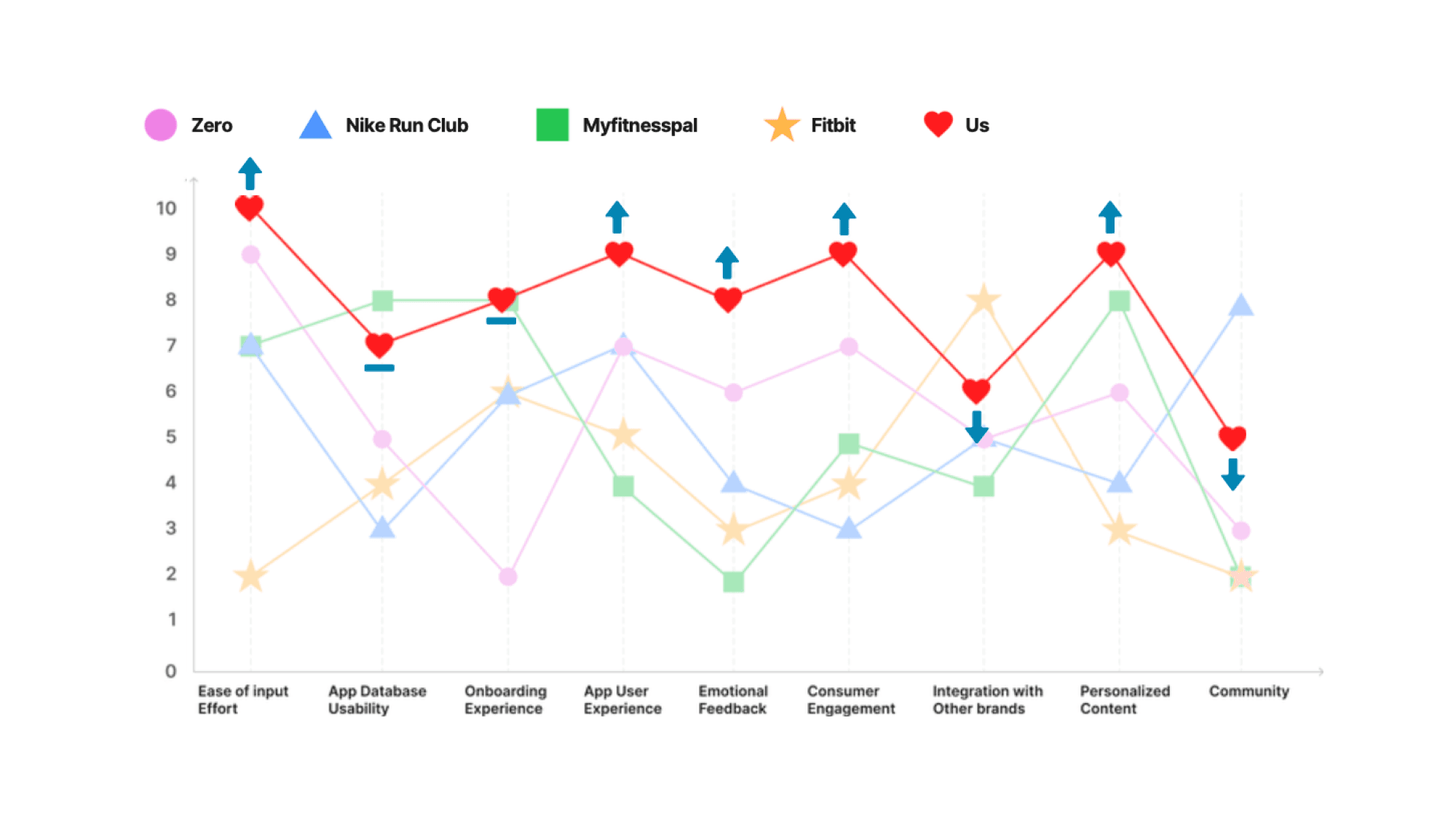 Guided by secondary research, the team framed a Blue Ocean map to study high-impact functions of our top competitors. This helped us visualize where our product could carve out a niche without directly competing, offering greater growth potential in an already crowded market.