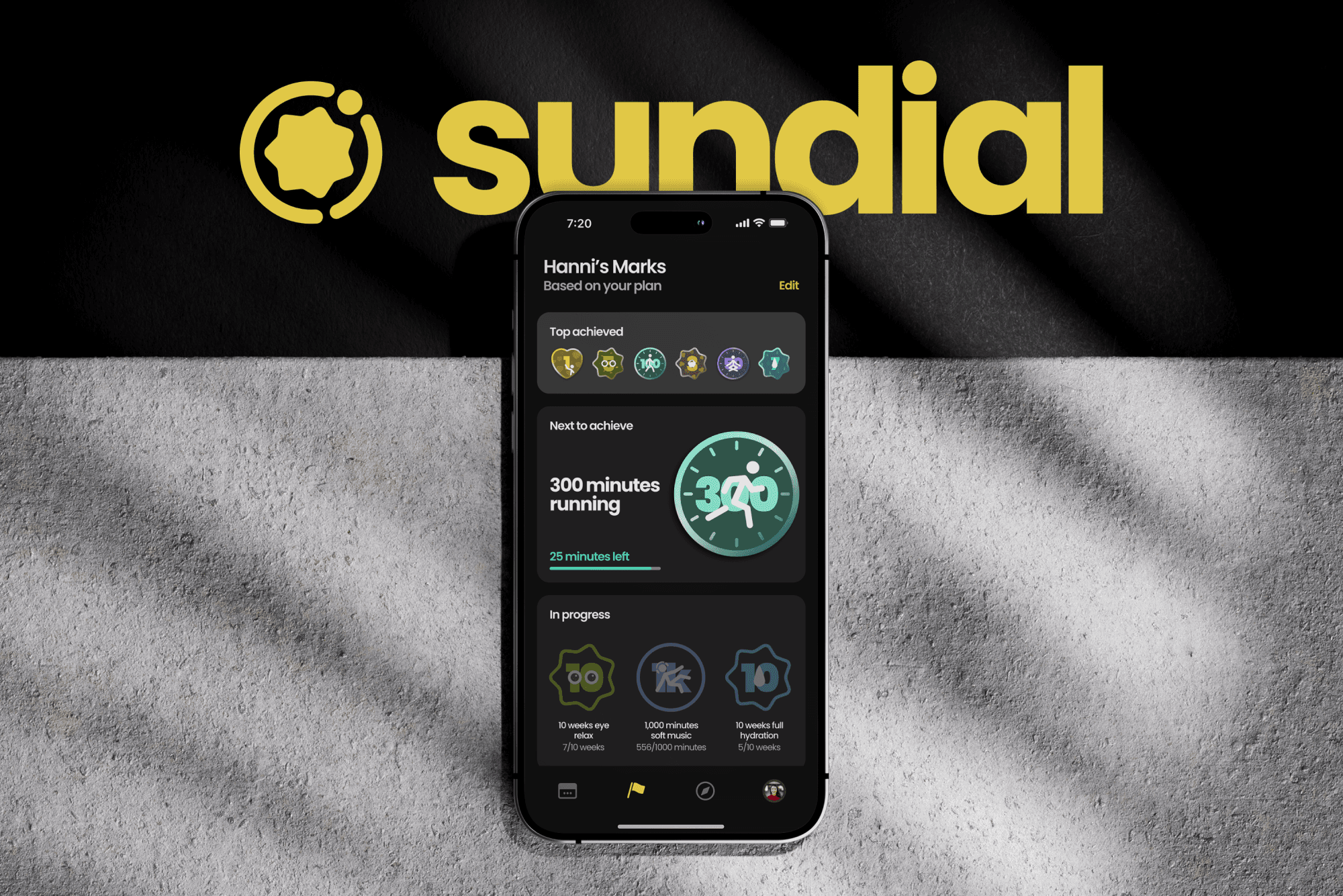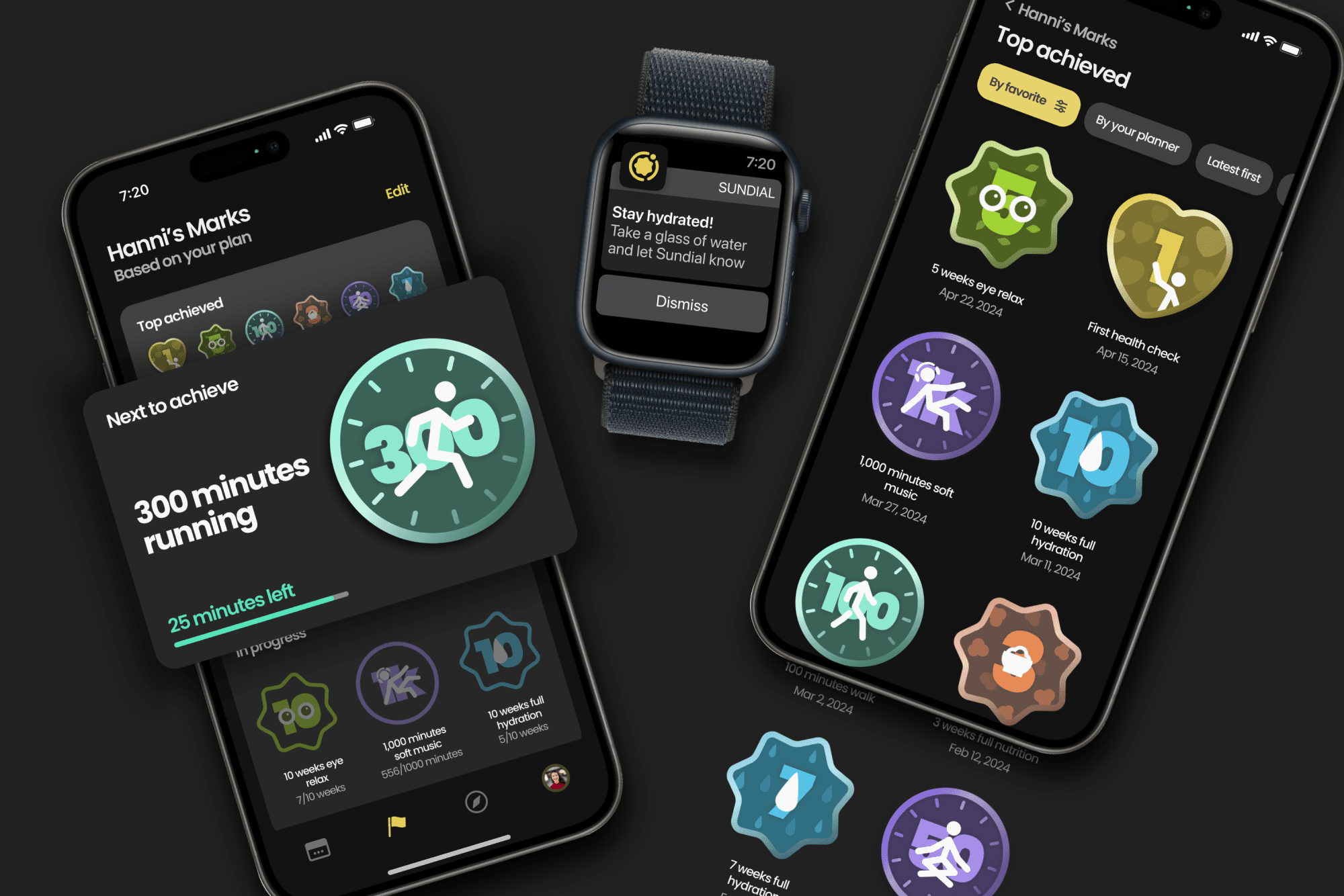 Emotional influence. Using generative AI, our badge system — called Marks (like the marks on a sundial) — visualizes unique badges tailored to each user's individual wellness goals, making the achievement process feel special and rewarding.