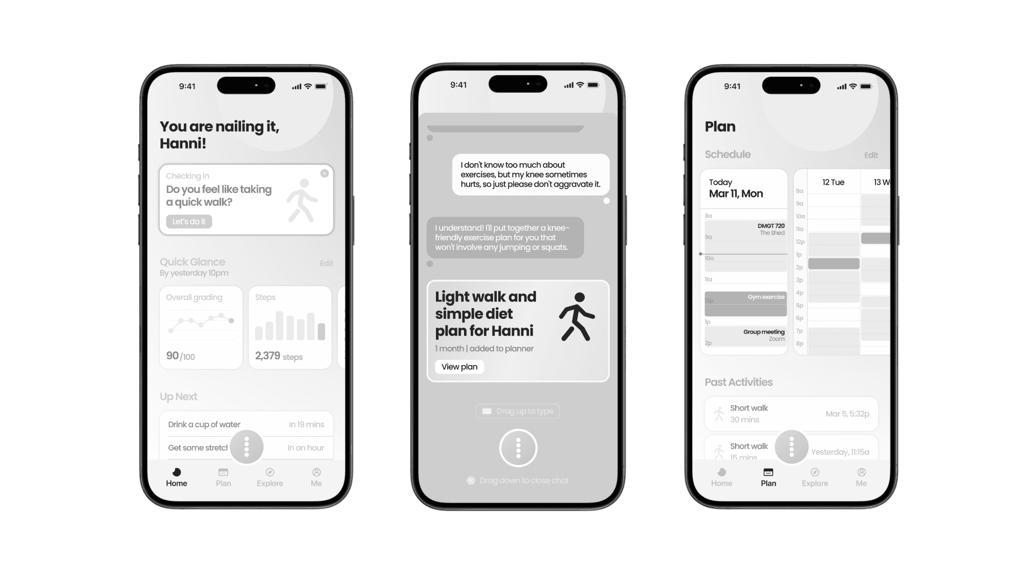 After synthesizing feedback and conducting additional research, I recognized that AI capabilities could be essential to the feasibility of the wellness planner. By integrating these functionalities through research and prototyping, I designed and animated the following visual mockup showcase: