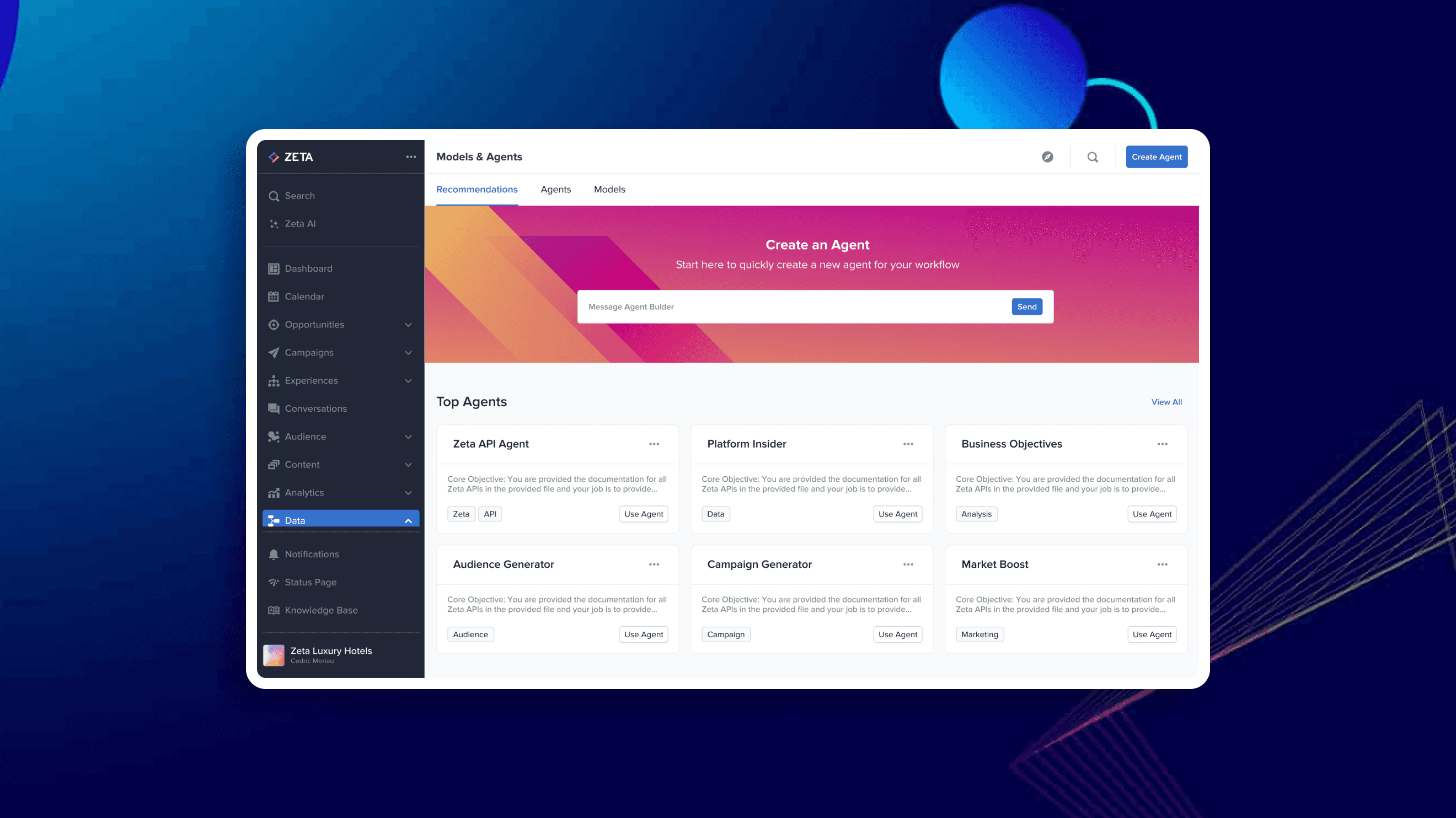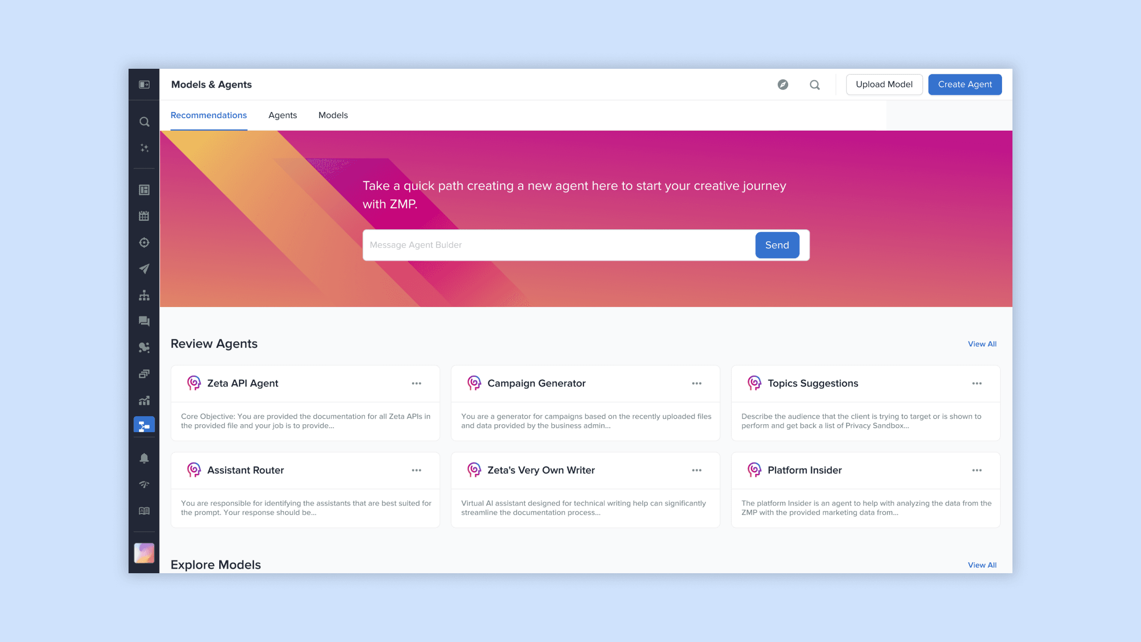 The primary Recommendation tab functions as a general entry point for popular actions, with a particular emphasis on the prioritized 'Create Agent' feature through the appealing banner component.