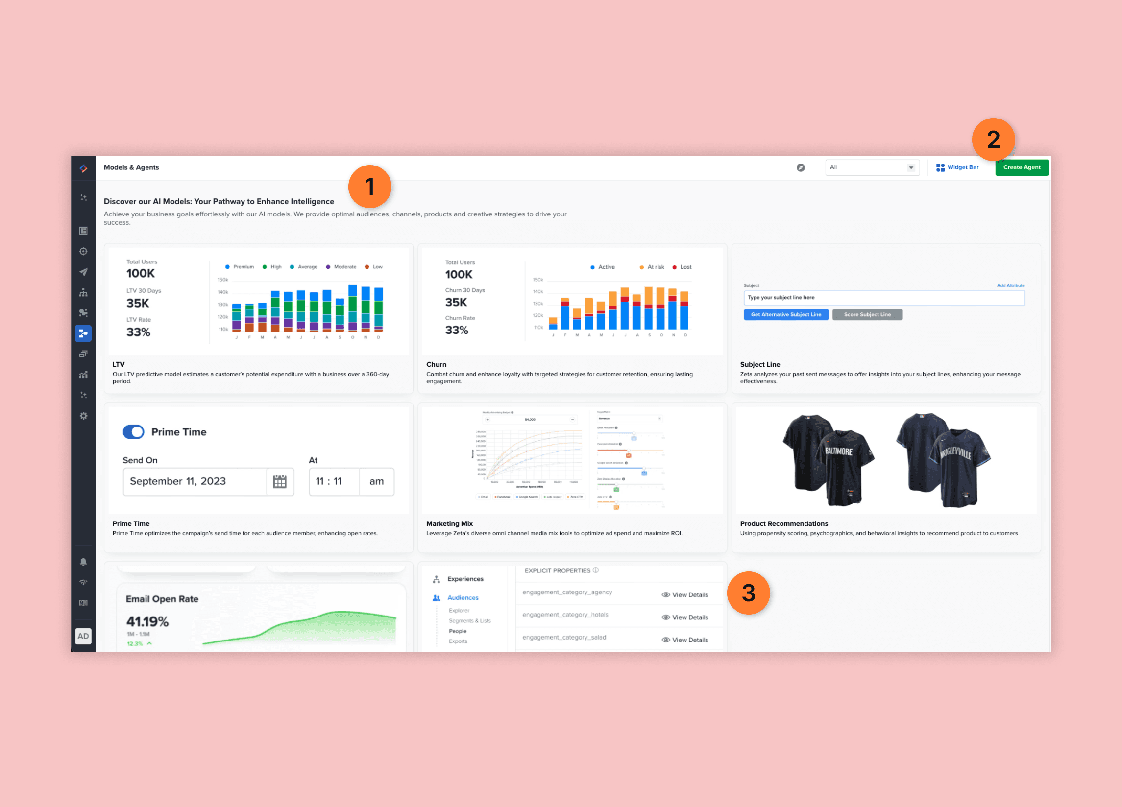 One of the primary functions of this page is to enable users to create new AI agents for their marketing needs. Highlighting this call-to-action can significantly enhance its value and frequency of usage.